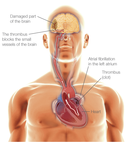 في حالة الإصابة بالرجفان الأذيني، تنبض حجرات القلب بشكل عشوائي وغير منتظم. ويمكن أن يتسبب هذا في تراكم الدم في أذين القلب، ويتجمع معًا، ويشكل جلطات دموية. ويمكن بعد ذلك أن تنتقل هذه الجلطات الدموية عبر مجرى الدم إلى الدماغ، ومن ثم تتعرض الأوعية الدموية للانسداد ويُسبب هذا سكتة دماغية. ويتمثل الجزء الخطير من الرجفان الأذيني في أن حوالي 70% من نوبات الرجفان الأذيني لا تظهر عليها أعراض ولا يتم تشخيصها. بالإضافة إلى ذلك، يظهر الرجفان الأذيني في بدايته بشكل عام بشكل غير منتظم، وبالتالي يمكن تجاهله حتى في أثناء زيارات الطبيب المتفرقة. ويمكن أن تؤدي عوامل الخطر التالية إلى زيادة خطر الإصابة بالرجفان الأذيني: العمر، وارتفاع ضغط الدم، والسكري، والسمنة، وأمراض القلب والأوعية الدموية، والضغط العصبي، والتدخين، والكحول.